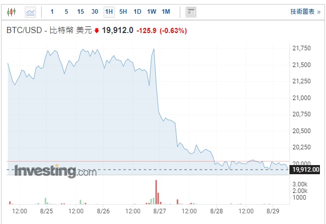 智通财经APP获悉,上周五美联储主席鲍威尔在杰克逊霍尔会议上发表讲话后,比特币跟随美股下行,暴跌7.6%。周日,加密货币市场进一步回落,MVIS Crypto Compare数字资产100指数连续第四天下跌1%。目前比特币徘徊在接近20000美元的水平,截至发稿,比特币下跌0.63,报19912美元/枚。