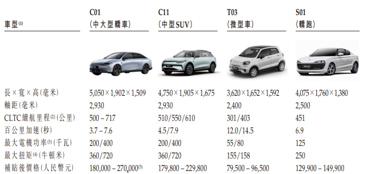 于2022年5月,公司推出一款智能纯电动中大型轿车C01。C01基于C11同一平台打造。根据弗若斯特沙利文的资料,C01在诸多方面配置均超越同价位区间竞品电动车型。C01Pro+高性能版拥有同价位区间的电动车型竞品中最快的加速能力,百公里加速最快可达3.7秒。