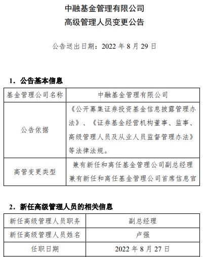 8月29日,中融基金发布高级管理人变更公告称,经中融基金管理有限公司第四届董事会第三十一次会议审议通过,新任卢强为副总经理,任职日期2022年8月27日。新任黄庆为首席信息官,任职日期2022年8月27日。原副总经理马荣荣、原首席信息官黎峰均因工作离任,或将转任该公司其他管理岗位。