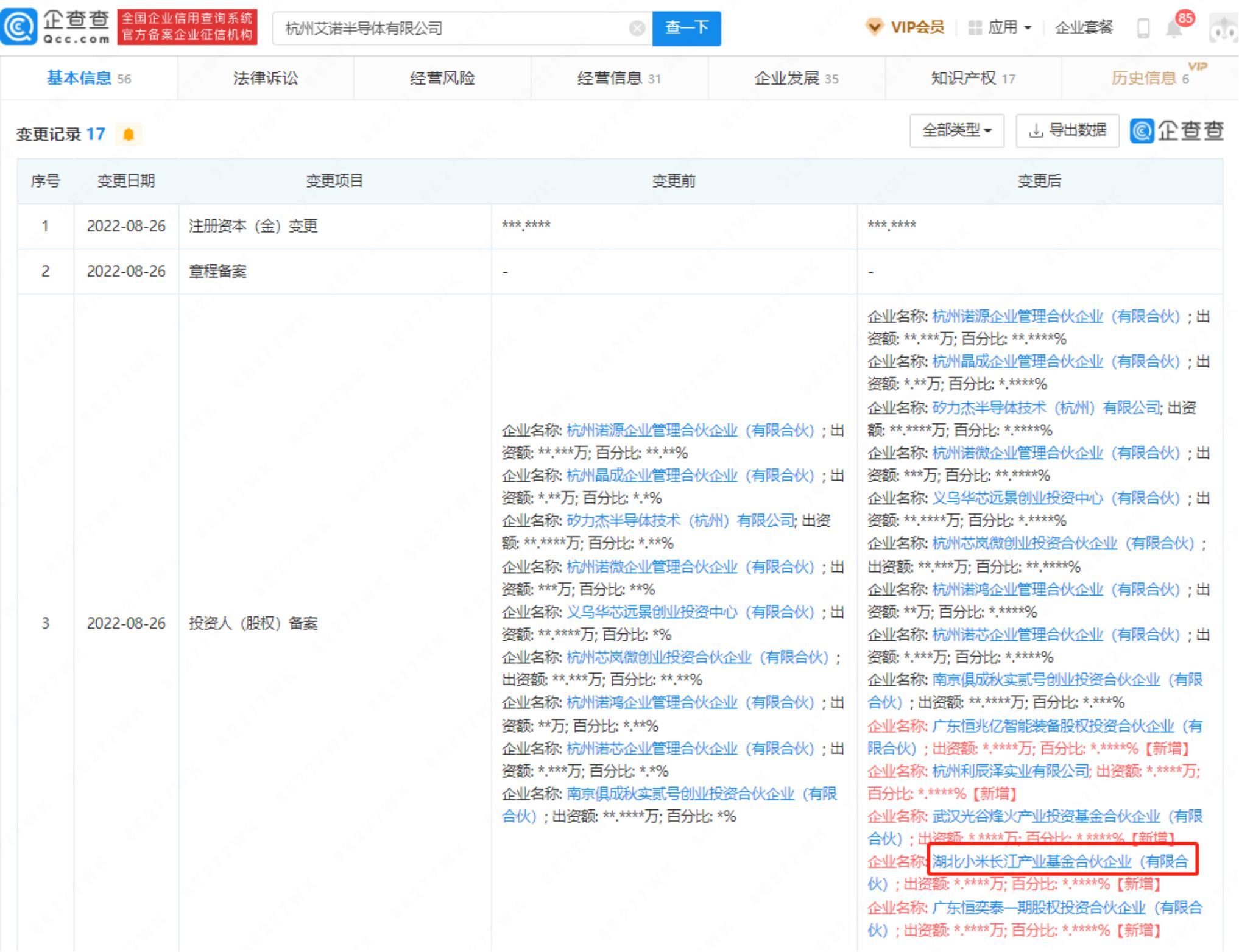 智通财经APP获悉,企查查APP显示,杭州艾诺半导体有限公司(下称:艾诺半导体)近日发生工商变更,新增小米旗下的湖北小米长江产业基金合伙企业(有限合伙)等为股东。