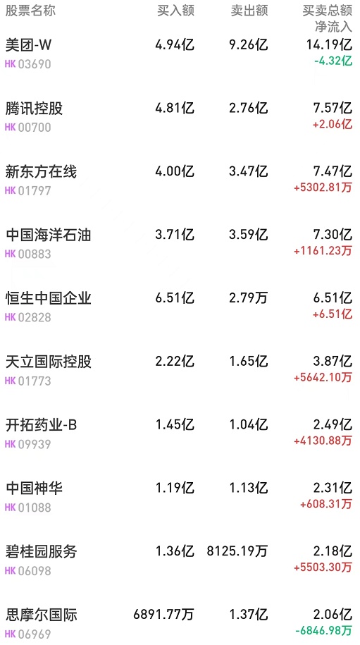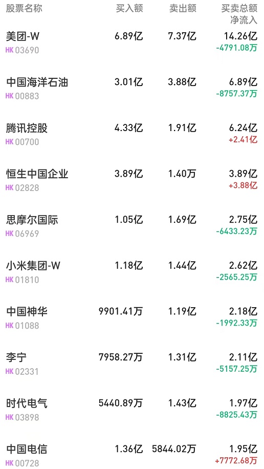 此外,恒生中国企业(02828)、天立国际控股(01773)、开拓药业-B(09939)分别获净买入10.39亿、5642万、4130万港元。而中海油(00883)、李宁(02331)、中国神华(01088)分别遭净卖出7596万、5157万、1384万港元。
