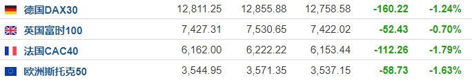 2. 截至发稿,德国DAX指数跌1.24%,英国富时100指数跌0.70%,法国CAC40指数跌1.79%,欧洲斯托克50指数跌1.63%。