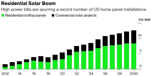 美国更高的电价和《通货膨胀削减法案》中的税收抵免期限延长,正在推动使用太阳能的居民数量反弹。为了追求更清洁的能源,并减少对电网的依赖,消费者开始拥有自己的电力供应系统,因为电网越来越容易受到极端天气、野火和干旱造成的停电的影响。