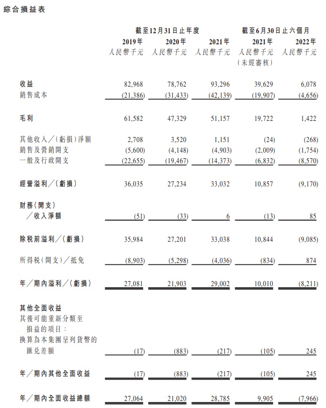 财务方面,于2019年、2020年、2021年及2022年上半年,公司收益分别为人民币8296.8万元(人民币,下同)、7876.2万元、9329.6万元及607.8万元。同期,年内溢利分别为人民币2708.1万元、2190.3万元、2900.2万元及-821.1万元。