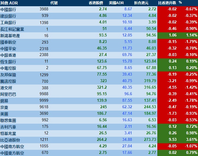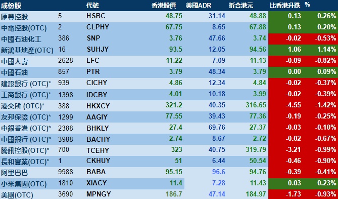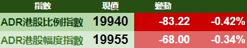智通财经APP获悉,周一美股三大指数集体收跌,港股ADR指数下跌,按比例计算,收报19940点,较香港收市跌83.22点或0.42%。