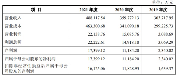 财务方面,于2019年度、2020年度及2021年度,公司营业收入分别约为30.37亿元人民币、35.98亿元人民币及48.81亿元人民币;同期,净利润分别约为0.234亿元人民币、1.12亿元人民币及1.74亿元人民币。