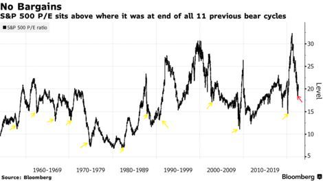 尽管估值大幅调整,股票仍不便宜。在6月的低点,标普500指数的市盈率为18倍,超过了20世纪50年代以来所有11个熊市周期中位于低谷的估值。换句话说,如果股市从这里反弹,它将是有史以来最昂贵的熊市底部。