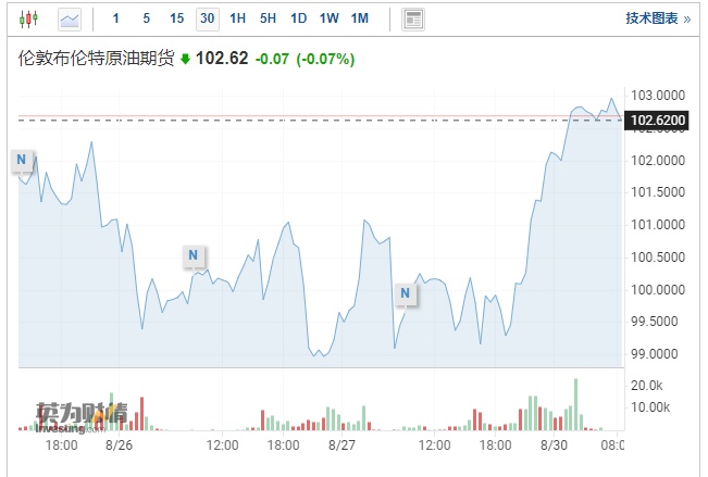 智通财经APP获悉,根据美国能源部的数据,截至8月26日当周,美国战略石油储备减少了310万桶,总库存降至4.5亿桶,为1984年12月以来的最低水平。但由于OPEC+可能减产以及利比亚冲突影响石油供应,周一油价延续上周涨势,上涨超3美元/桶。截至发稿,布伦特原油报102.62美元。