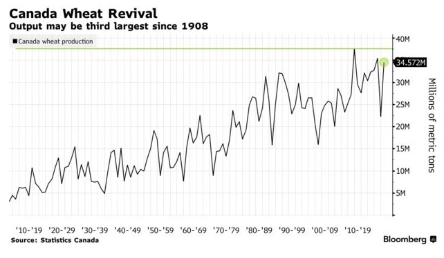 加拿大统计局周一表示,由于气候条件改善、气候温和,小麦产量有所提高,该国今年的产量将增长55%,至3460万吨。这使得2022年将成为1908年以来第三大丰收年,略低于2020年和2013年创纪录的3760万吨。