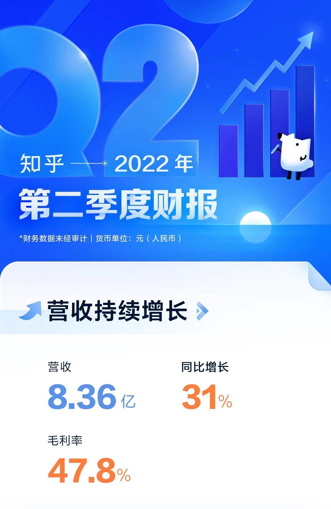 8月30日,中国最大的问答式在线社区知乎(ZH.US,02390)公布了2022年第二季度未经审计的财务报告。在“生态第一”战略下,知乎正追求可持续的高质量增长,第二季度营收达到8.36亿元(人民币,下同),同比增长31%,同时毛利率达47.8%。付费会员和职业教育业务带来的C端收入持续高速增长,付费会员收入在总收入中占比第一,职业教育收入同比增长达到600.5%。