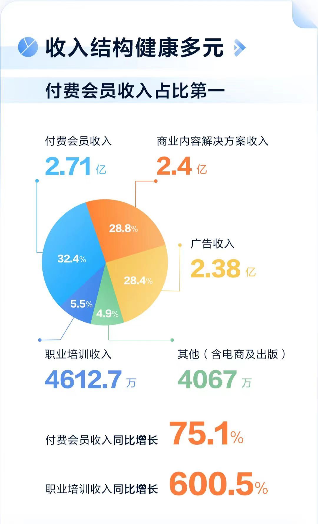 面对疫情、广告主投放整体下滑等大环境挑战,以商业内容解决方案、广告为代表的知乎B端收入获得稳健增长,显示出强大的韧性。商业内容解决方案收入达到2.4亿元,广告收入达到2.38亿元,二者在公司总收入中占比达到57.2%。