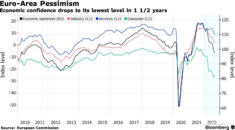 由于能源短缺危及产出,价格飙升抑制需求,欧元区8 月工业和服务业的景气指数下降。尽管8 月消费者信心指数意外从历史低点反弹,但家庭对前景的悲观程度超过了疫情期间。
