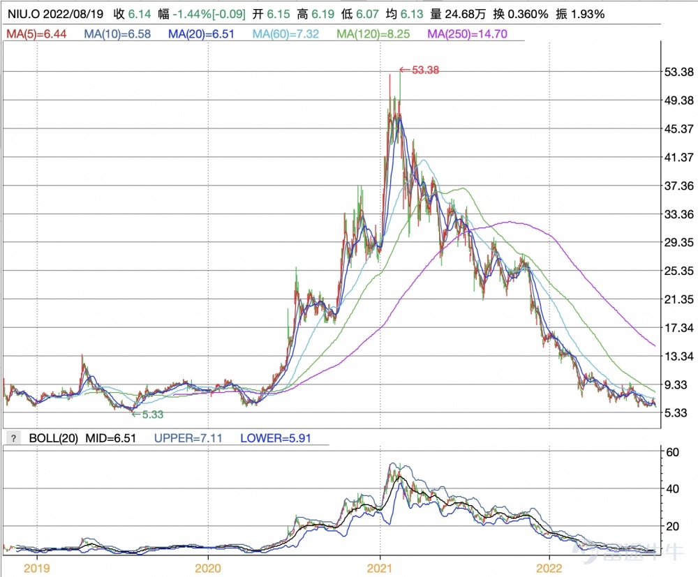 受业绩表现影响,小牛电动的股价不断下行。截止8月19日,股价降幅已达到13.84%。2018年,小牛电动在美股纳斯达克成功上市,此后股价一路上涨,并在2021年2月16日时,达到53.38美元的高点,但一年多之后,其市值已蒸发了近9成。