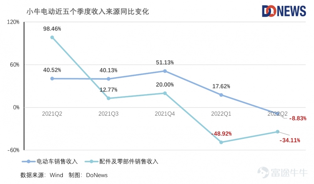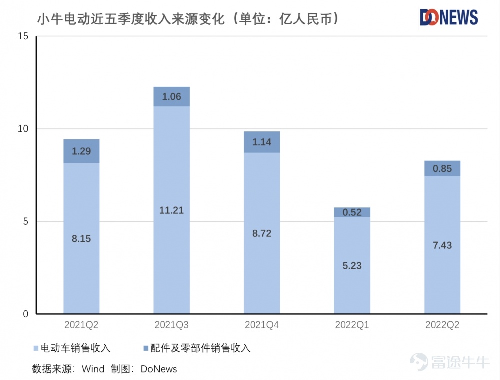 对此,小牛电动只是将其归咎于疫情,财报中表示:“销量的下降主要是由于上海、北京和其他一线城市的新冠病毒封锁,导致了线下零售流量的下降及物流发货受到限制的缘故,这些封锁区域的营收占比国内总销售额的35%-55%。”从小牛电动的收入来源变化来看,受疫情影响最重的2022Q1,来自电动车销售的收入的确环比大幅缩水至5.23亿,同比增长仅为17.62%,不过2022Q2表现更差,同比下跌了8.83%。