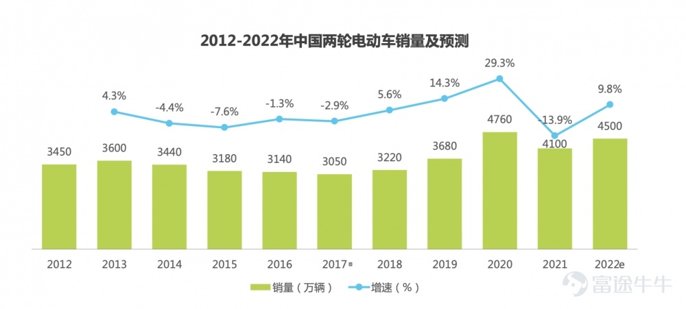 两轮电动车主要是用来满足“中短程”出行需求的工具,具有成本低,灵活性高等特点,成为不少居民首选的出行方式之一。艾瑞咨询数据显示,自2018年开始,两轮电动车的年销量就在不断上升,预计到2022年时,销量将达到4500万辆,同比增速达到9.7%。