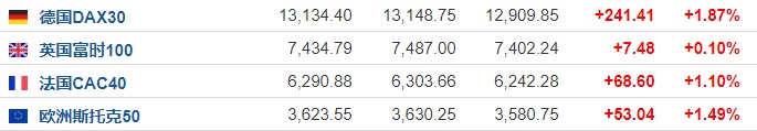 2. 截至发稿,德国DAX指数涨1.87%,英国富时100指数涨0.10%,法国CAC40指数涨1.10%,欧洲斯托克50指数涨1.49%。