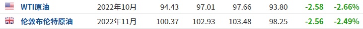 3. 截至发稿,WTI原油跌2.66%,报94.43美元/桶;布伦特原油跌2.49%,报100.37美元/桶。