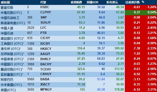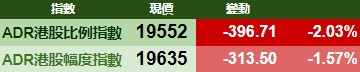 智通财经APP获悉,周二美股三大指数集体收跌,港股ADR指数下跌,按比例计算,收报19552点,较香港收市跌396.71点或2.03%。