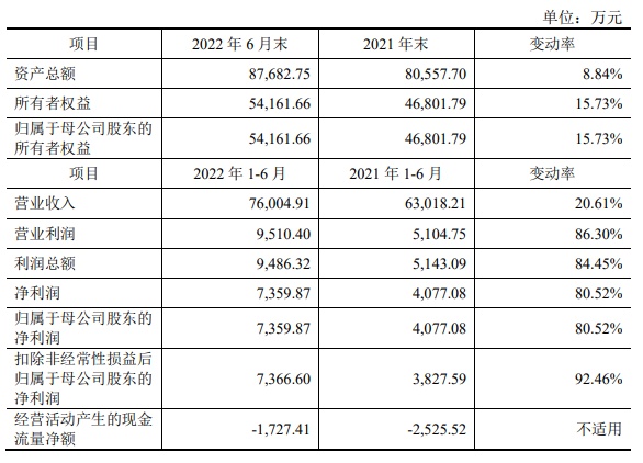 招股书显示,2022年上半年,嘉华股份营业收入约7.60亿元,同比增长20.61%。主要原因系一方面,随着上游主要原材料大豆价格上涨及因限电减产等因素大豆蛋白行业整体供应紧张导致的产品价格上涨,另一方面,2022 年公司新厂区油脂车间正式投产,2022 年 1- 6 月豆油和低温食用豆粕销量增长较多,较上年同期分别增长 28.31%和 290.50%。扣除非经常性损益后归属母公司股东的净利润为7366.60元,同比增长92.46%。