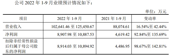 2022 年 1-9 月嘉华股份预计营业收入和扣除非经常性损益后归属母公司股东的净利润中位数分别为约11.40亿元和9904.48万元,较上年同期分别增长29.49%和120.74%。