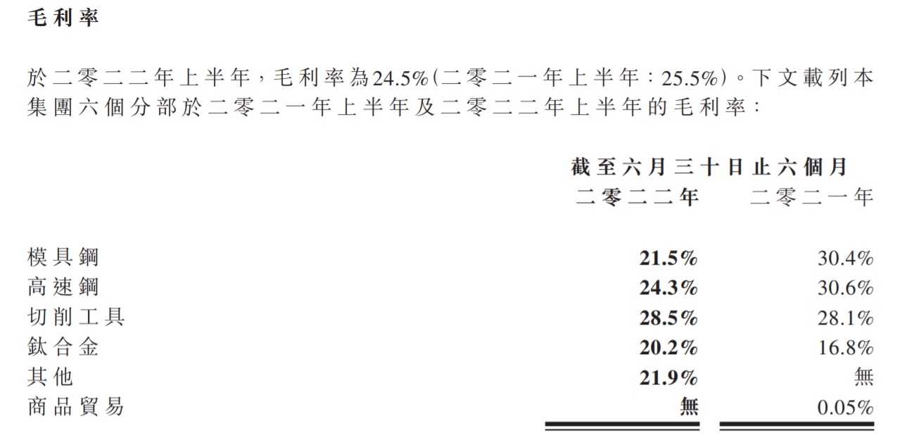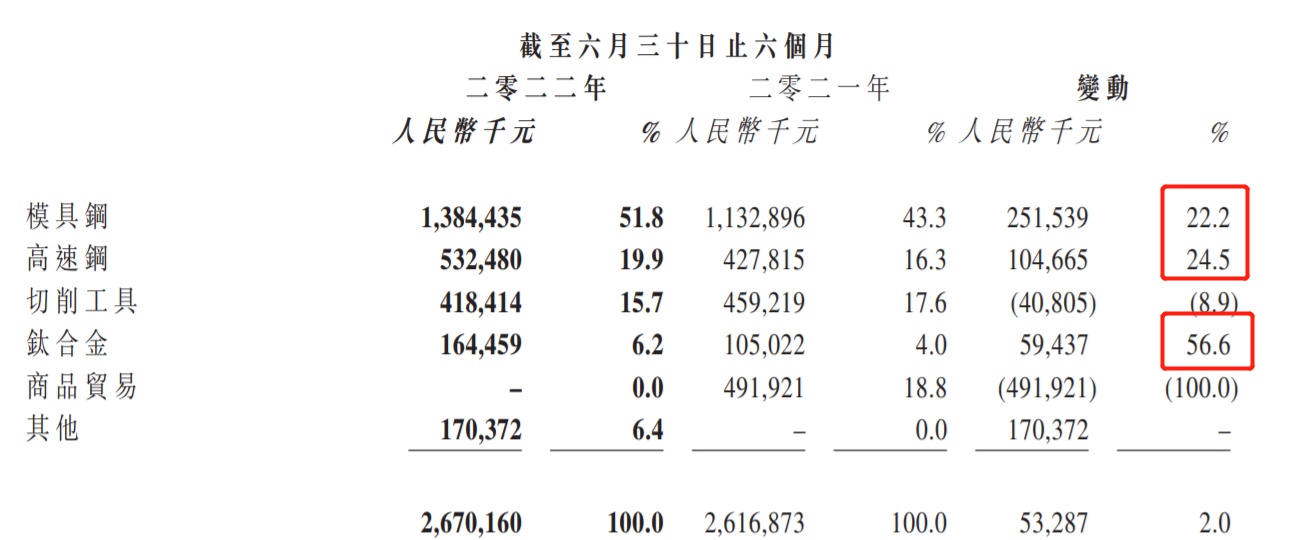 据财报显示,报告期内,天工国际模具钢、高速钢的收入增速分别为22.2%、24.5%,二者收入合计占公司总收入的比例超70%。钛合金收入亦录得增长,同比提升56.6%至1.64亿元。切削工具收入则下滑8.9%。