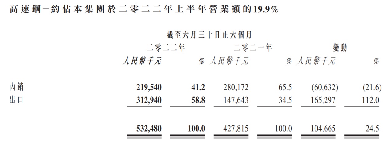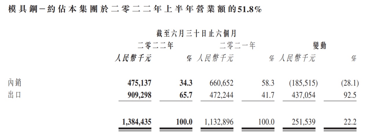 详细来看,模具钢22.2%的收入增长背后,主要由出口拉动,出口收入大增92.5%,这主要是因为欧洲陷入地缘政治危机,战争导致石油及天然气等能源价格持续飙升,致使海外钢铁产品出现供需失衡,从而带来了旺盛的海外需求。内销则因国内市场在疫情扰动下需求下滑,导致收入下降28.1%。