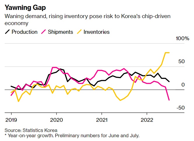 智通财经APP获悉,根据韩国国家统计局周三表示,韩国芯片制造商7月份的工厂出货量出现了近三年来的首次下降,突显出作为全球经济晴雨表的半导体需求疲软。