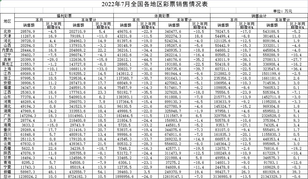 1-7月累计,与上年同期相比,15个省份彩票销量出现增长。其中,广东、新疆、湖南和浙江增加额较多,同比分别增加19.41亿元、19.24亿元、4.55亿元和4.13亿元。