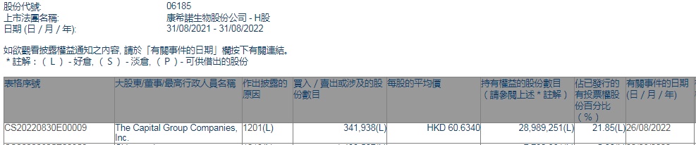 智通财经APP获悉,香港联交所最新资料显示,8月26日,美国资本集团减持康希诺生物-B(06185)34.1938万股,每股作价60.6340港元,总金额约为2073.31万港元。减持后最新持股数目约为2898.93万股,最新持股比例为21.85%。