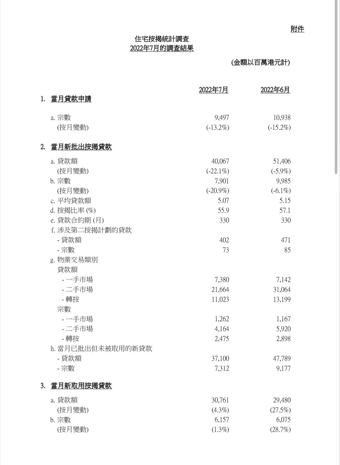 智通财经APP获悉,8月31日,香港金融管理局公布2022年7月份的住宅按揭统计调查结果。7月份新申请贷款个案较6月份按月减少13.2%,至9497宗。7月份新批出的按揭贷款额较6月份减少22.1%,至401亿港元。当中,涉及一手市场交易所批出的贷款增加3.3%,至74亿港元;涉及二手市场交易所批出的贷款减少30.3%,至217亿港元。至于涉及转按交易所批出的贷款,则减少16.5%,至110亿港元。