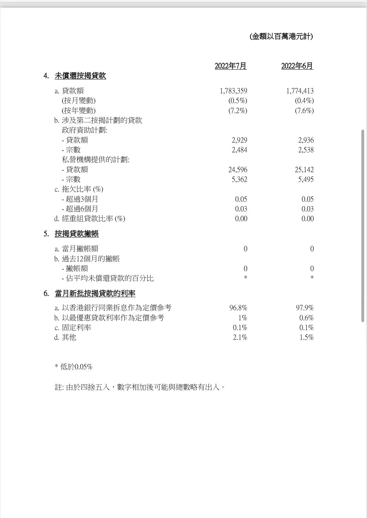 7月份新取用按揭贷款额较6月份增加4.3%,至308亿港元。以香港银行同业拆息作为定价参考的新批按揭贷款所占比例,由6月份的97.9%下降至7月份的96.8%。以最优惠贷款利率作为定价的新批按揭贷款所占比例,由6月份的0.6%上升至7月份的1%。7月底未偿还按揭贷款总额按月增加0.5 %,至17834亿港元。按揭贷款拖欠比率维持于0.05%,经重组贷款比率维持于接近0%。
