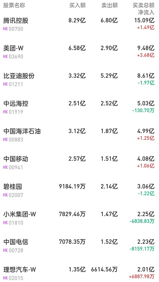 北水净买入最多的个股是美团-W(03690)、腾讯(00700)、中移动(00941)。北水净卖出最多的个股是微创医疗(00883)、中国电信(00728)、中国神华(01088)。