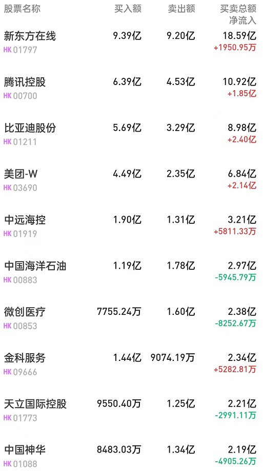 科网股再获北水资金追捧,美团-W(03690)、腾讯(00700)分别获净买入5.81亿、3.34亿港元。消息面上,中泰国际表示,阿里、美团、京东、拼多多等互联网巨企的季绩均优于市场预期,一方面反映此前投资者对公司的预期较低,另一方面印证降本增效的效果明显,若较低的估值隐含了投资者较低的预期,那么当前超预期的业绩表现其实有利公司的估值修复。