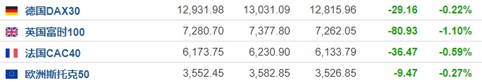 2. 截至发稿,德国DAX指数跌0.22%,英国富时100指数跌1.10%,法国CAC40指数跌0.59%,欧洲斯托克50指数跌0.27%。