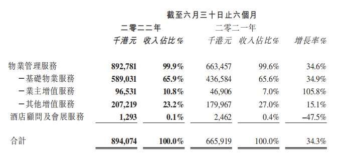 财报显示,从业务层面而言,华发物业服务是一家以物业管理服务为核心,以酒店顾问服务、会展服务为辅助的全国性社区生活运营商和综合设施服务商。期内,公司物业管理服务收入占总营收比例高达99.9%。而以物业管理服务为核心主营业务,包括三大业务板块,即基础物业服务、业主增值服务及其他增值服务。