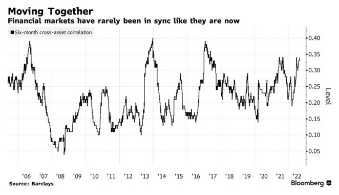 每个市场都受到美联储政策及其对经济的影响的驱动。资产之间的联系加强了,迫使每个投资者都成为宏观交易员。巴克莱银行追踪的一项跨资产相关性指标接近过去17年的最高水平。