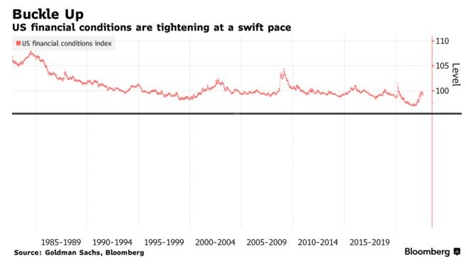 所有这些打击都转化为金融环境的紧缩,美联储政策制定者可能会对此感到安心,因为他们正寻求加息和降低资产价格,以缓和过热的需求。