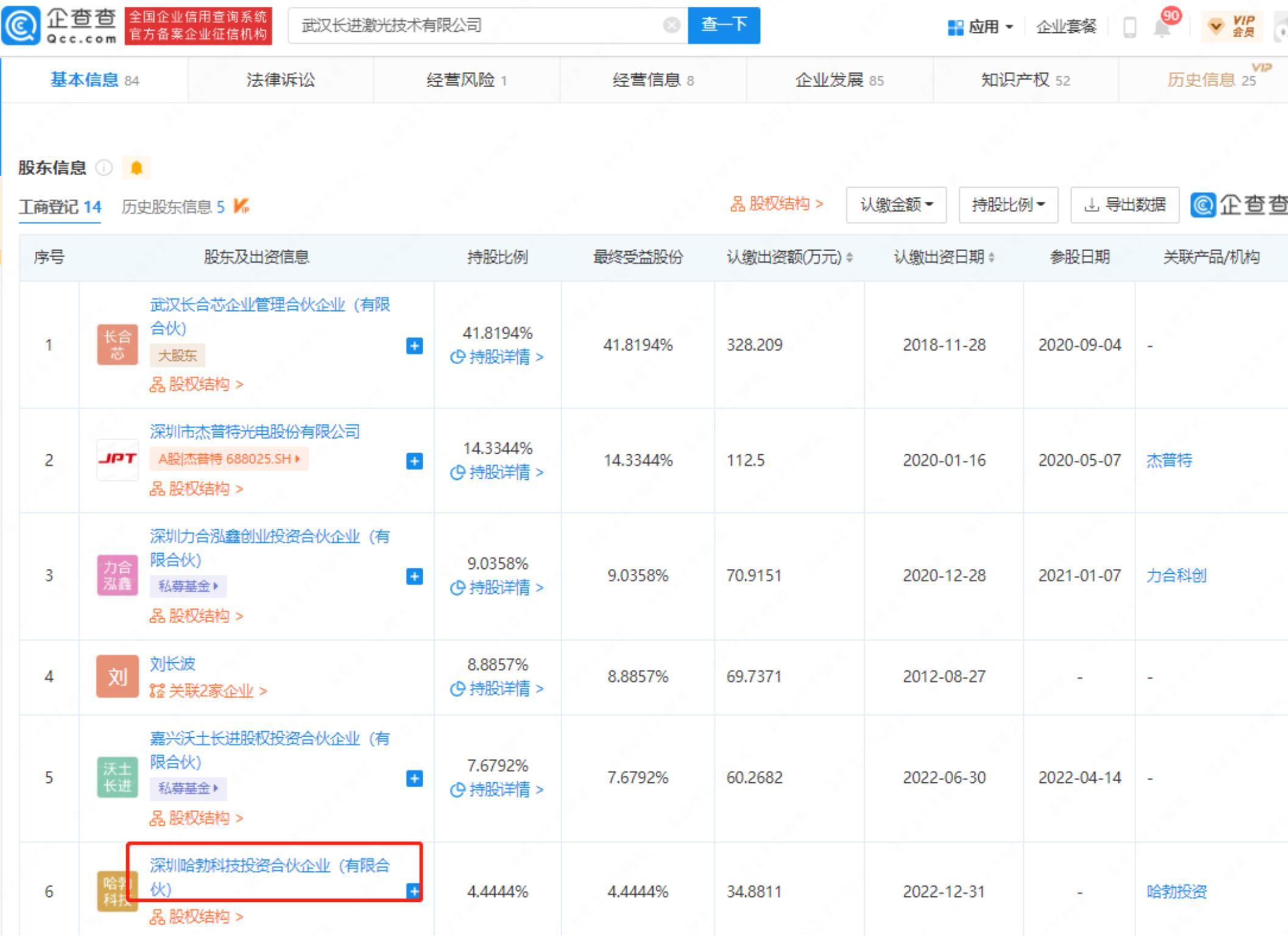 智通财经APP获悉,企查查APP显示,近日,武汉长进激光技术有限公司发生工商变更,新增华为关联公司深圳哈勃科技投资合伙企业(有限合伙)为股东。同时,公司注册资本由749.94万元人民币增加至784.82万元人民币。