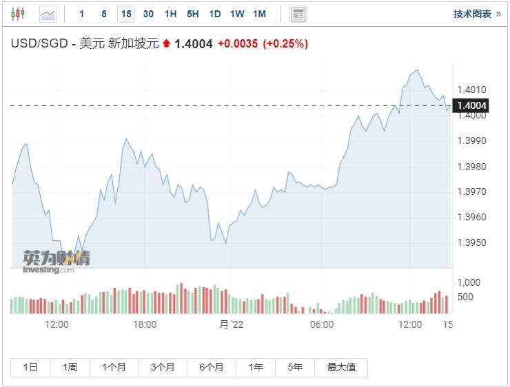 截至发稿,新加坡元下跌0.25%,至1美元兑1.4004新加坡元。