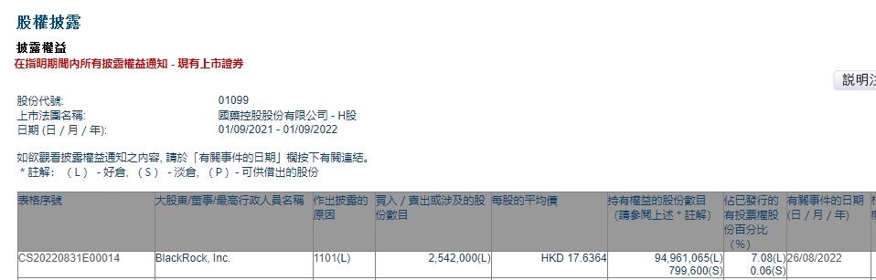 智通财经APP获悉,香港联交所最新资料显示,8月26日,贝莱德增持国药控股(01099)254.2万股 每股作价约17.6364港元,总金额约为4483.17万港元。增持后最新持股数目约为9496.11万股,最新持股比例为7.08%。