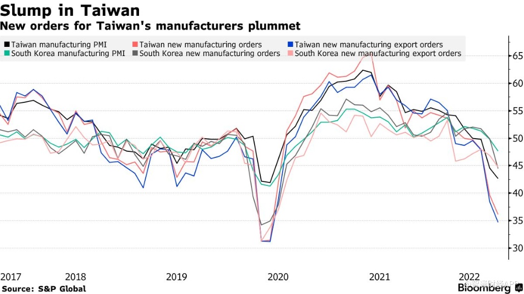 在亚洲,中国台湾PMI降至42.7,为2020年5月以来的最低水平,而韩国PMI则降至47.6,为2020年7月以来的最低水平。日本的PMI也在下降,不过仍高于50的荣枯线。