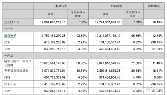 分产品类型来看,精密功能件、结构件及模组仍是公司的主要收入来源,实现收入100.79亿元,占总收入比例的68.08%,同比增长11.4%;充电器及精品组装为公司第二大收入来源,上半年实现30.72亿元的收入,同比增长18.31%。值得一提的是,公司的汽车产品在上半年显著发力,实现收入4.13亿元,同比大增296.75%。