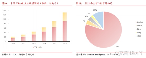根据IDC统计,2021年全球VR/AR 总投资规模接近 146.7 亿美元,并有望在2026年增至 747.3 亿美 元,五年CAGR 将达 38.5%,2021年中国市场支出规模约 21.3 亿美元并将在 2026 年提升至130.8亿美元,CAGR预计可达 43.8%,增速位列全球第一,其中VR仍为主要领域,占比约为 70%以上。