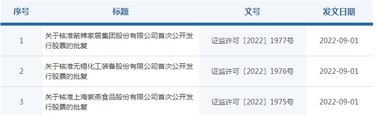 智通财经APP获悉,9月1日,中国证监会发布关于核准箭牌家居集团股份有限公司、无锡化工装备股份有限公司、上海紫燕食品股份有限公司首次公开发行股票的批复,分别核准三家公司公开发行不超过9661股、2000万股、4200万股新股。