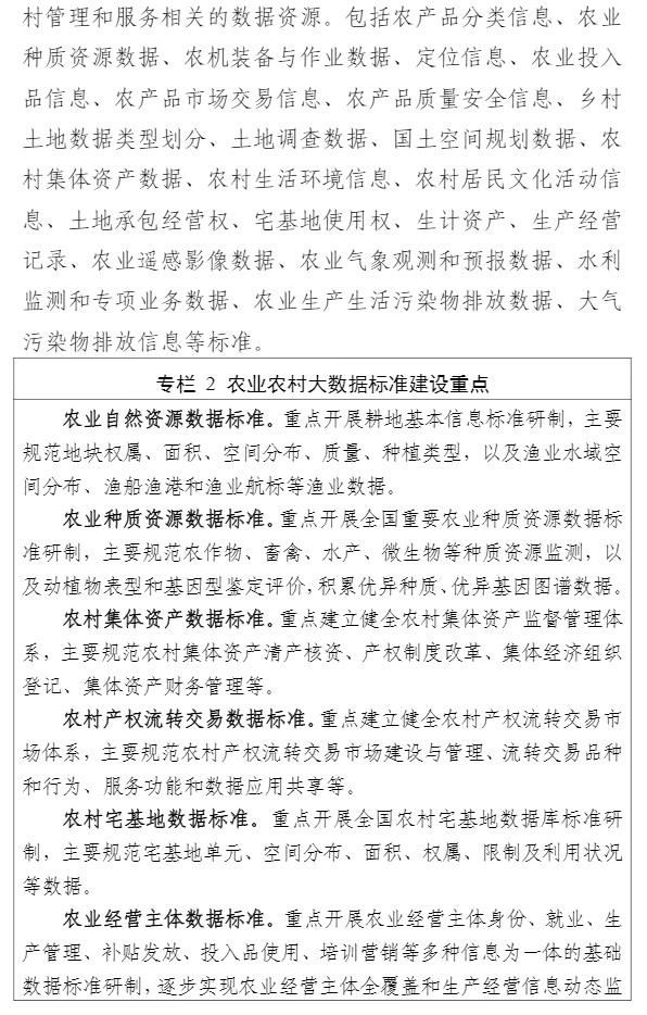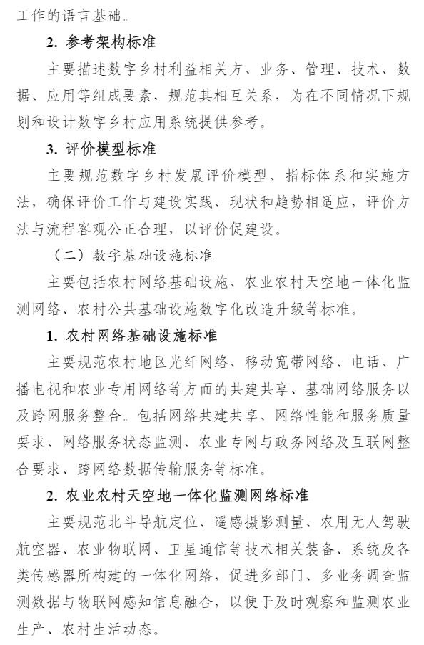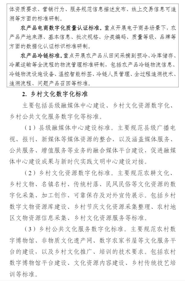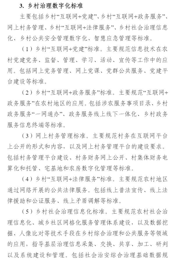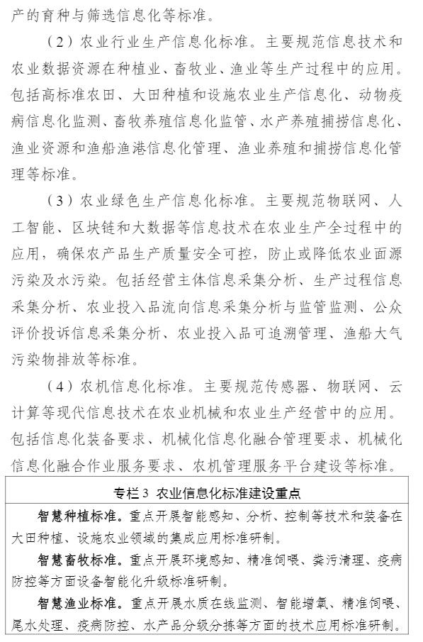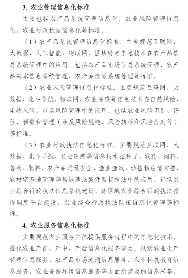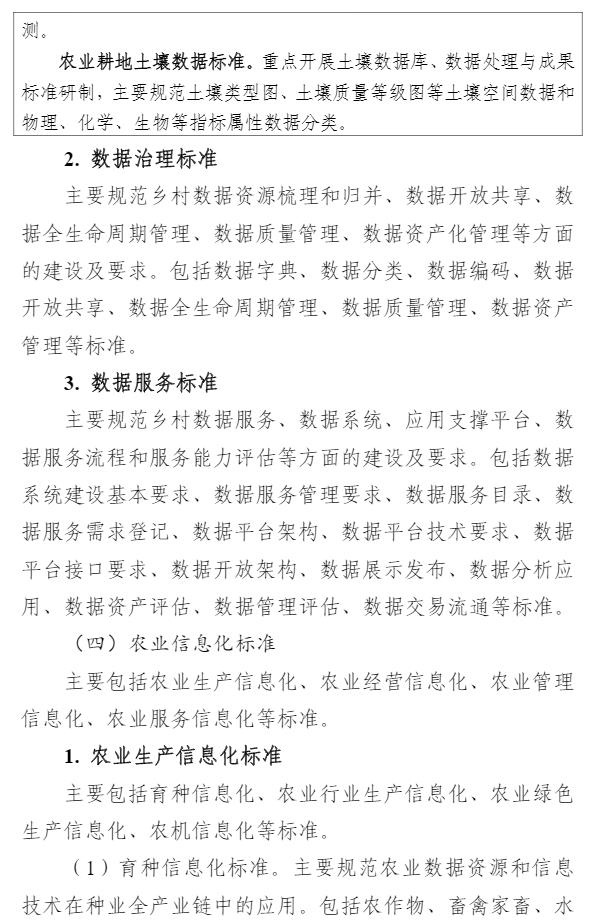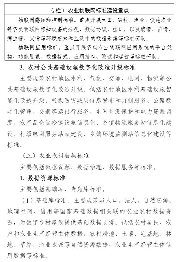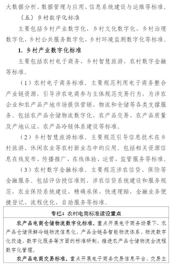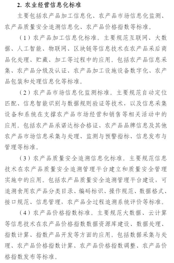 智通财经APP获悉,9月1日,中央网信办等四部门印发《数字乡村标准体系建设指南》,目标到2025年,初步建成数字乡村标准体系。《指南》以专栏的形式部署了4个方面重点任务。一是农业物联网标准建设方面,重点开展物联网感知和控制标准、物联网应用标准的研制。二是农业农村大数据标准建设方面,重点开展农业自然资源数据标准、农业种质资源数据标准、农村集体资产数据标准、农村产权流转交易数据标准、农村宅基地数据标准、农业经营主体数据标准、农业耕地土壤数据标准的研制。三是农业信息化标准建设方面,重点开展智慧种植标准、智慧畜牧标准、智慧渔业标准的研制。四是农村电商标准建设方面,重点开展农产品电商仓储物流数字化标准、农产品电商交易标准、农产品电商数字化质量认证标准、农产品冷链标准的研制。