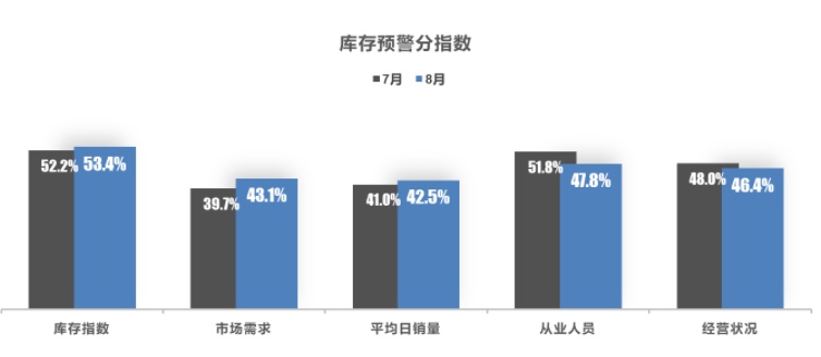 从分指数情况看:8月库存、市场需求、平均日销量指数环比上升,从业人员、经营状况指数环比下降。