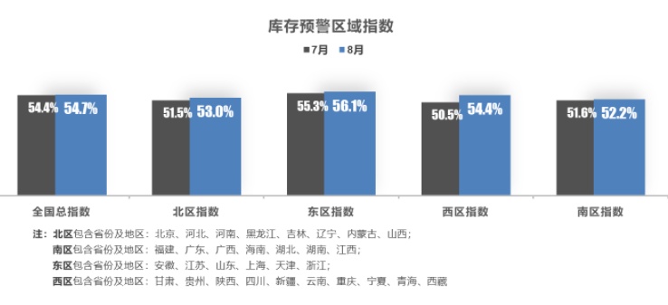 从区域指数情况看: 8月全国总指数为54.7%,北区指数为53.0%,东区指数为56.1%,西区指数为54.4%,南区指数为52.2%。