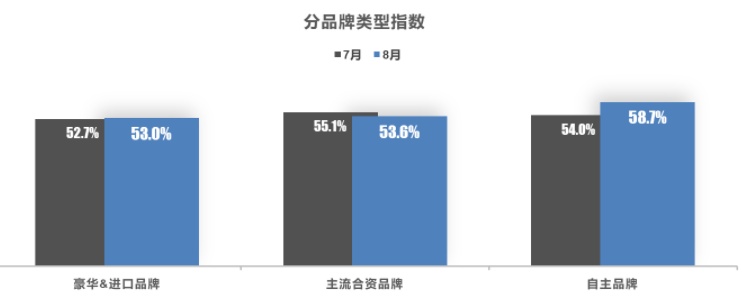 从分品牌类型指数看:从分品牌类型情况看,8月进口&豪华品牌、自主品牌指数环比上升, 主流合资品牌指数环比下降。