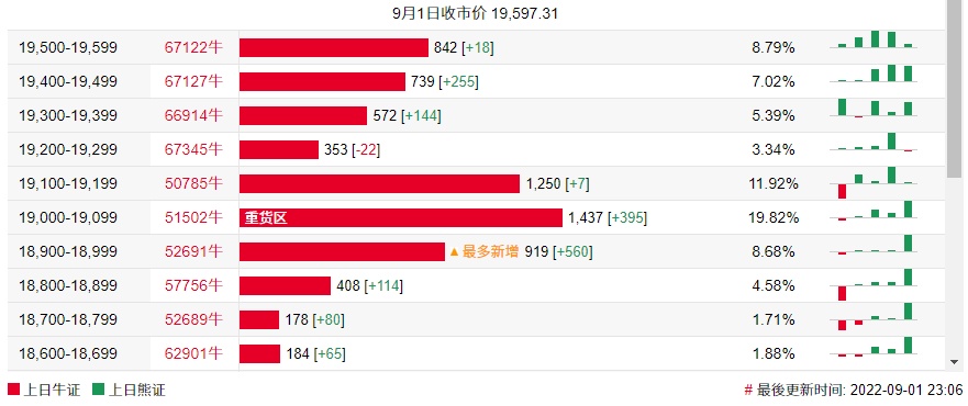 牛证街货重货区在19,000-19,099区间,该区间最新牛证数量为1437张,较上一交易日增加395张;最多新增在18,900-18,999区间,该区间最新牛证数量为919张,较上一交易日增加560张。