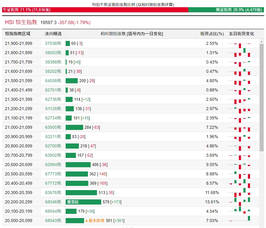法兴恒指牛熊证街货分布图中的数据显示,熊证街货重货区在20,200-20,299区间,该区间最新熊证数量为579张,较上一交易日增加173张。最多新增在20,000-20,099区间,该区间最新熊证数量为301张,较上一交易日增加301张。